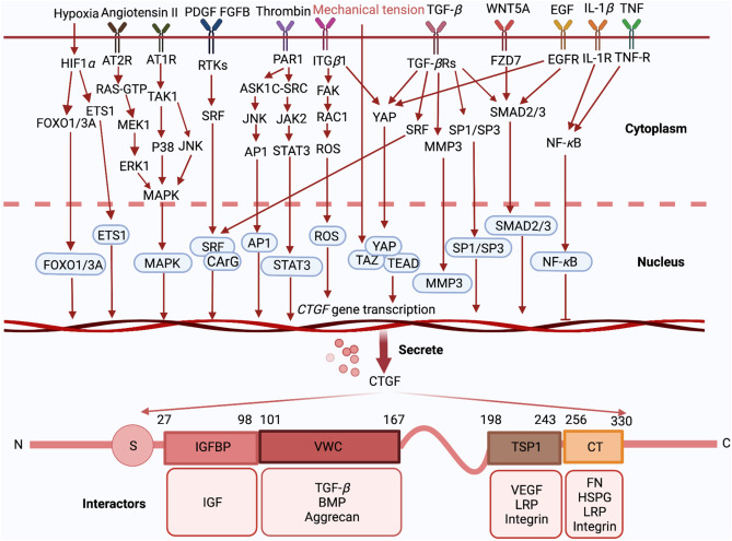图3 在外界刺激下CTGF相关的信号通路会被激活,导致CTGF转录和CTGF分泌。CTGF的IGFBP、VWC、TSP1、CT等四个不同结构域分泌后,可与多种物质相互作用,发挥生理功能。