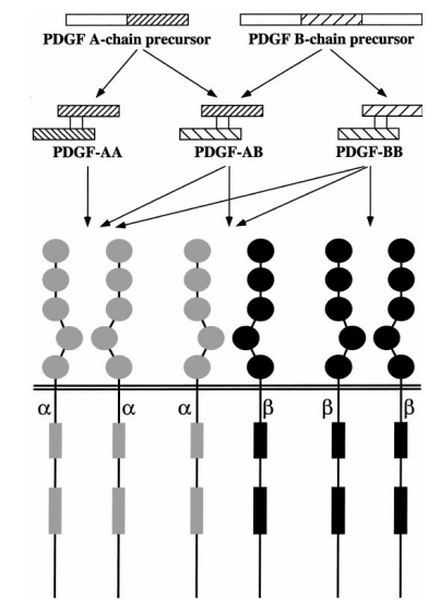 1.血小板衍生生长因子(Platelet Derived Growth Factor, PDGF)由两个亚基组成。这些亚基链被称为A (18 kDa)和B (12-14 kDa),具有高度同源性的肽序列,包括相同位置的8个半胱氨酸残基。PDGF的三种亚型,AA、BB同二聚体和AB异二聚体分布在不同的组织和细胞系中,表明这些亚型具有不同的功能。细胞表面可见两种类型的PDGF受体α和β,PDGFRα可以结合PDGD的A和B亚基,而PDGFRβ只能结合B亚基。PDGF(AA)结合αα,PDGF(AB)形成αα和αβ的二聚体,PDGF(BB)可以形成αα、αβ和ββ三种二聚体。这些二聚体PDGFR是活性形式。[1]