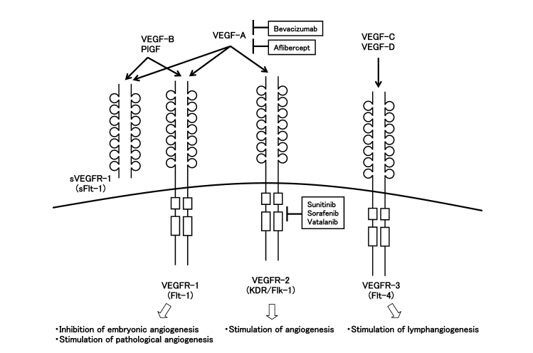 通常VEGF即VEGF-A是发育性血管发生、血管生成和祖内皮细胞分化的关键调节剂。VEGF-B在非新生血管形成的肿瘤中起作用。VEGF-C和VEGF-D在癌组织的新生血管和新生淋巴管的形成过程中起作用。VEGF-E也是一种潜在的新生血管形成因子,PIGF促进新生血管形成,使血管通透性增加。